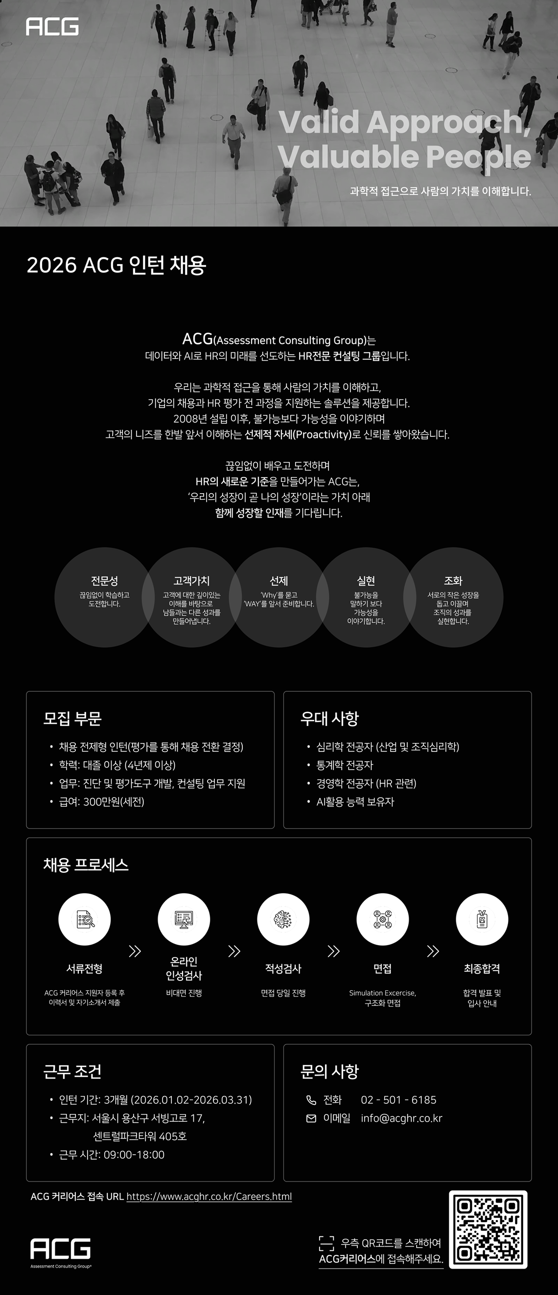 안녕하세요, HR 전문 컨설팅 그룹 ACG에서 2026 인턴 채용을 진행하고 있습니다.
